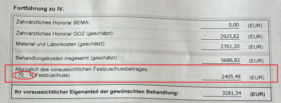 Der Festzuschuss reduziert die Gesamtkosten und es verbleibt der Eigenanteil fĂŒr den Versicherten. Sie finden diese Kalkulation auf ihrem Heil- und Kostenplan unter dem Punkt IV: